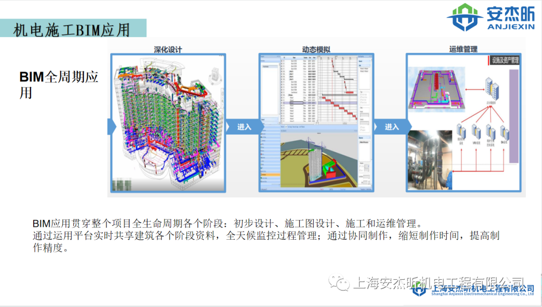 BIM应用贯穿整个项目全生命周期各个阶段:初步设计、施工图设计、施工和运维管理。通过运用平台实时共享建筑各个阶段资料,全天候监控过程管理;通过协同制作,缩短制作时间,提高制作精度。